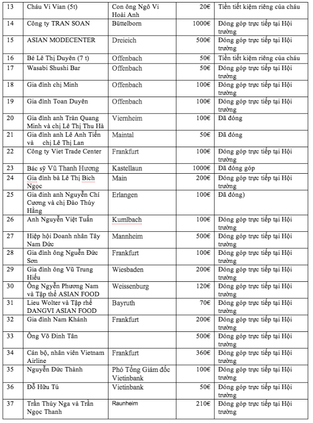 SWIFT-BIC: HELADEF1822Trường hợp cần xác nhận số tiền đóng góp của bà con để miễn trừ thuế đề nghị nêu rõ yêu cầu để Ban Tổ chức xác nhận theo mâu quy định của Chính phủ Đức. Mọi đóng góp đều được công khai trên các phương tiện thông tin đại chúng.