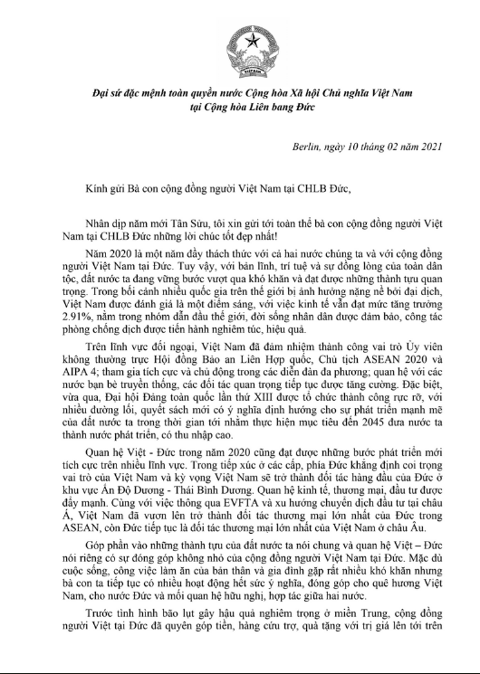 Năm nay, dịch bệnh không cho phép nhiều người trong chúng ta được hưởng một cái Tết đoàn viên, ấm áp bên người thân, trên quê hương Việt Nam thân yêu. Mặc dù vậy, tôi tin tưởng rằng dù đang ở đâu, quê hương, gia đình vẫn sẽ luôn trong tâm trí của mỗi người Việt trên nước Đức, là nguồn sức mạnh động viên chúng ta tiếp tục nỗ lực vì một tương lai tốt đẹp hơn cho bản thân mình, cho gia đình, cộng đồng và đất nước. Cũng rất tiếc là do tình hình dịch bệnh tại Đức và các biện pháp phòng chống dịch của Đức, năm nay Đại sứ quán Việt Nam tại Đức không thể tổ chức Tết cộng đồng cho bà con người Việt Nam tại Đức như truyền thống nhiều năm qua.